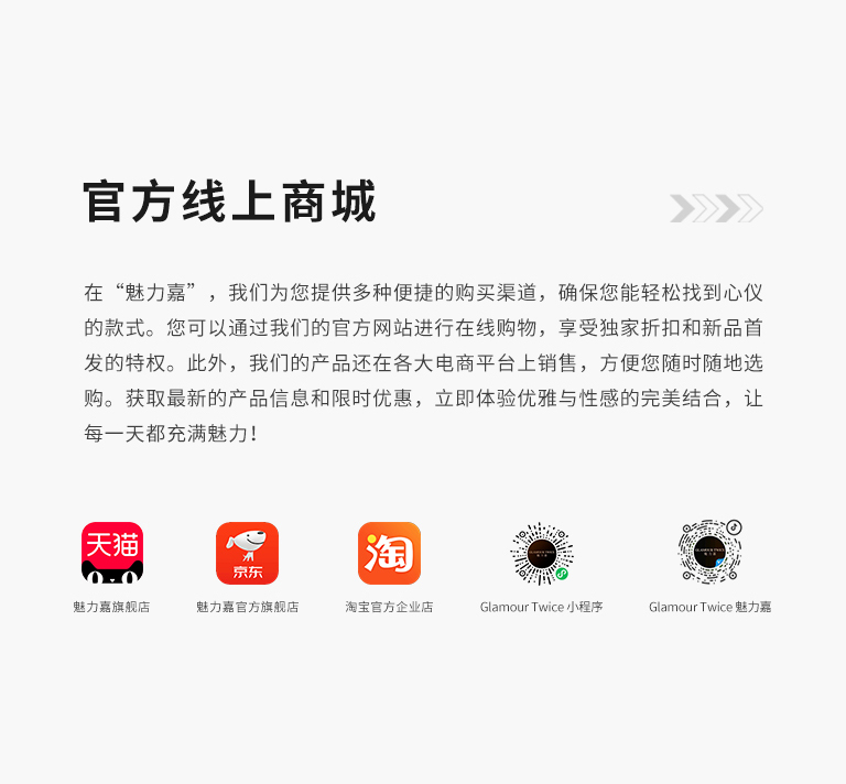 在“魅力嘉”,我们为您提供多种便捷的购买渠道,确保您能轻松找到心仪的款式。您可以通过我们的官方网站进行在线购物,享受独家折扣和新品首发的特权。此外,我们的产品还在各大电商平台上销售,方便您随时随地选购。获取最新的产品信息和限时优惠,立即体验优雅与性感的完美结合,让每一天都充满魅力!